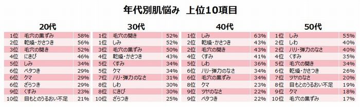 それに対して30代になると第7位と第8位に「ハリ・弾力のなさ」、「しわ」の悩みがランクイン。少しずつ肌がたるみ始めて「ほうれい線」が気になり始める年代ですね。